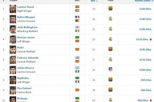体育资讯10月02日讯 德转今天发布了最新一期西甲身价更新,西甲前十身价也迎来些微的变化,最新西甲身价前十如下: