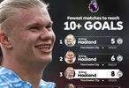至此,英超历史上最快单赛季进球上双榜的前三名被他独占。