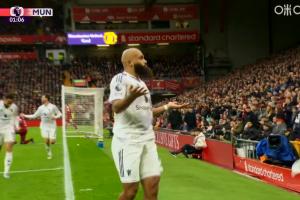 体育资讯10月19日讯 英超第8轮利物浦vs曼联,曼联先进一球,第1分钟姆伯莫破门,1-0领先利物浦。