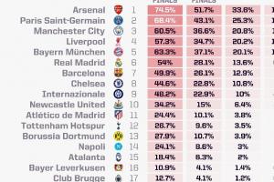 体育资讯10月21日讯 欧冠联赛阶段第三轮开赛在即,opta超级计算机更新了欧冠夺冠概率,其中阿森纳位列榜首,巴黎、曼城分列二三。