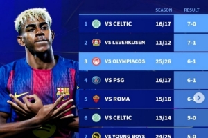 体育资讯10月22日讯 在本轮欧冠,巴萨6-1大胜奥林匹亚科斯。德转也盘点了巴萨队史在欧冠最大比分获胜纪录榜,具体如下:
