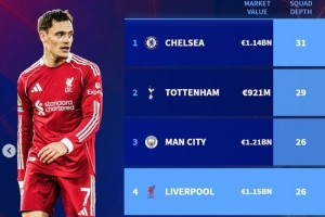 体育资讯10月30日讯 利物浦在本轮联赛杯做出大轮换最终主场0-3完败水晶宫,斯洛特在赛后抱怨球队人手不足。《转会市场》则统计了BIG6的阵容深度情况。