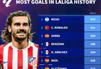 梅西和C罗分别打进474球和311球排名一二。本轮替补出战的格里兹曼打入一球,成为西甲历史上第11位达到这一成就的球员。
