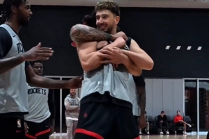 体育资讯10月2日讯 近日在火箭队内的训练中申京面对亚当斯的防守贡献了一记暴扣,之后又在后者面前投进了一个三分,结果惨遭海王“锁喉”。
