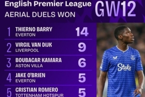 蒂尔诺·巴里对阵曼联完成14次成功争顶,是本赛季英超单场最多